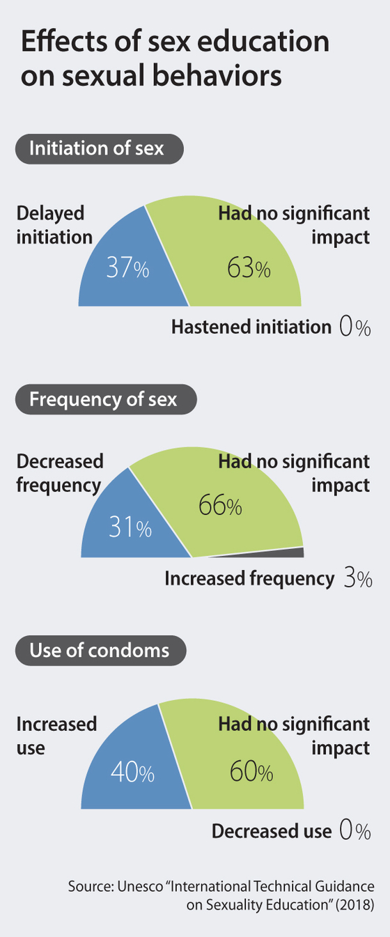 According to Unesco’s “International Technical Guidance on Sexuality Education,” first published in 2009 and updated in 2018, comprehensive sexuality education (CSE) actually delays sexual initiation as well as decreases the frequency of sex while increasing the use of condoms. Comprehensive sexuality education is a “curriculum-based process of teaching and learning about the cognitive, emotional, physical and social aspects of sexuality” as opposed to abstinence-only programs.