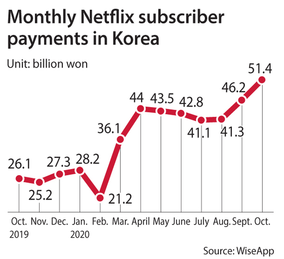 Koreans paid an estimated 51.4 billion won ($46.1 million) to Netflix for their October subscriptions, nearly doubled from the 26.1 billion won during the same period a year earlier. Compared to a month earlier, it is a 11.3 percent increase.
