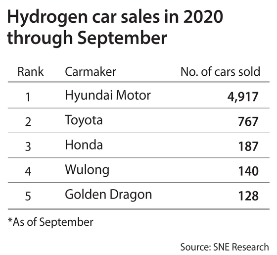 Seven out of 10 hydrogen-powered vehicles sold from January to September this year were from Hyundai Motor, according a local research and energy consulting firm Monday.