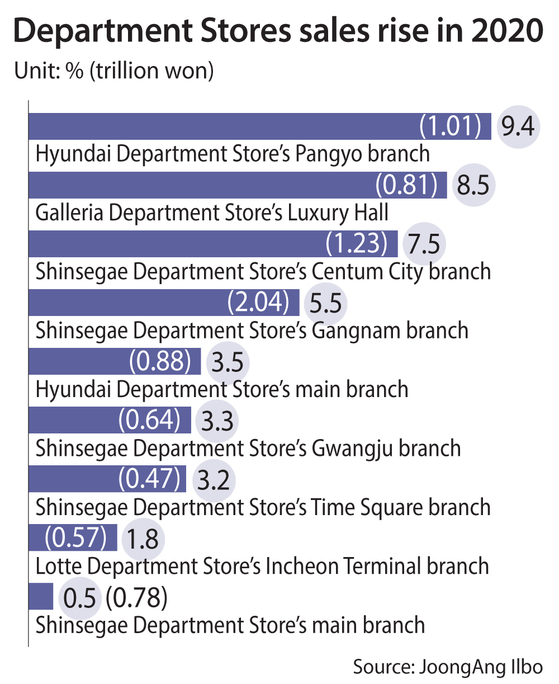 According to the retail industry, sales at most of the 60 department stores across the country were down at least double-digits last year due to the coronavirus pandemic. But at nine locations, sales may have actually increased: Five Shinsegae Department Store branches, two Hyundai Department Store branches, Lotte Department Store and Galleria Department Store.