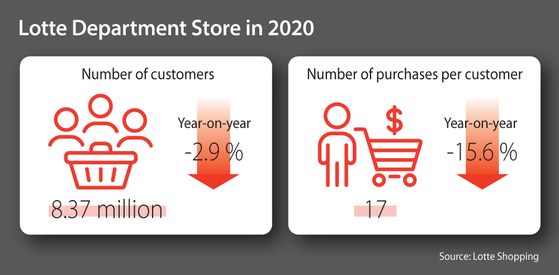 Customers on average went shopping at Lotte Department Store about 6.1 times last year. In 2019, the number was 7.5. They purchased products about 144.2 million times last year, down 18 percent compared to a year earlier.