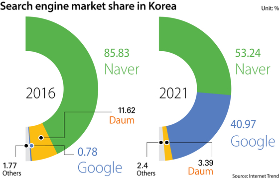 At the same time, the share of the homegrown portal shrank from 86 percent in 2016 to 53 percent this year. The change in the share indicates that the gain of Google has primarily come at the expense of Naver.