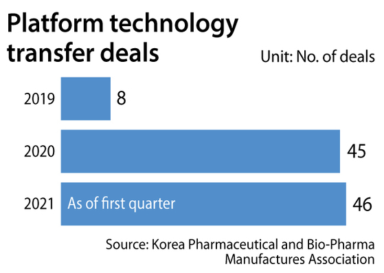Korean bio companies signed a total of eight deals to transfer their platform technologies in 2019, which increased to 45 in 2020, according to data provided by the Korea Pharmaceutical and Bio-Pharma Manufactures Association. In the first quarter of the year, the number already reached 46.