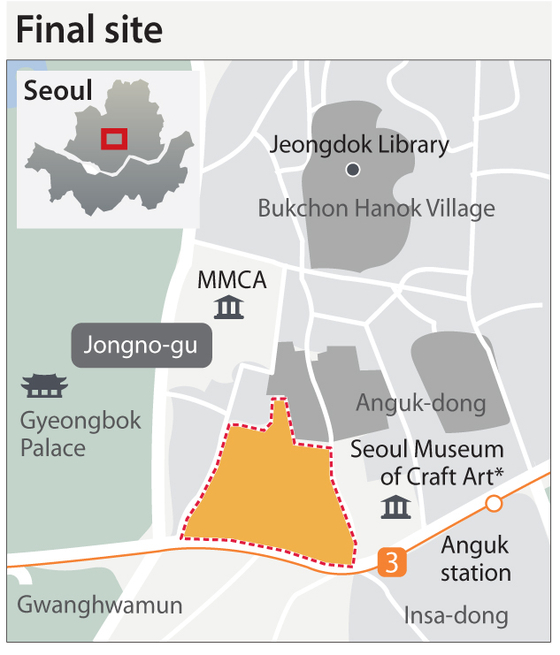 The committee said the Songhyeon-dong site was easier to access for the public than the Yongsan site, and offered easier collaboration with workforces at nearby museums, including the MMCA. The committee expects synergy between the new museum and existing museums, galleries and other cultural facilities around the Songhyeon-dong site. Close to the site are Gyeongbok Palace, MMCA, Seoul Museum of Craft Art and Bukchon Hanok village.