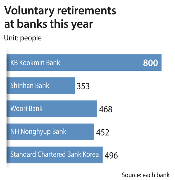 KB Kookmin Bank, Shinhan Bank, Woori Bank and NH Nonghyup Bank together lost a total of 2,073 employees through voluntary retirement this year as of Tuesday, up 35 percent on year, or by 539 people.