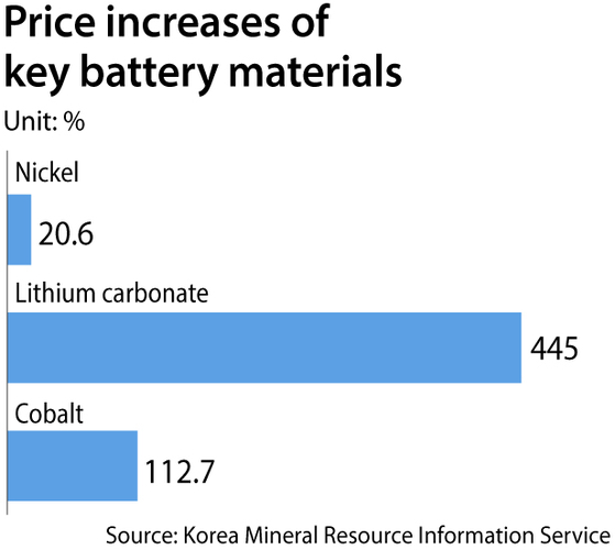 The price of lithium carbonate, which is used in the making of cathodes, is up 445 percent over the past year, according to the Korea Mineral Resource Information Service. Nickel is up 21 percent and cobalt by 113 percent.