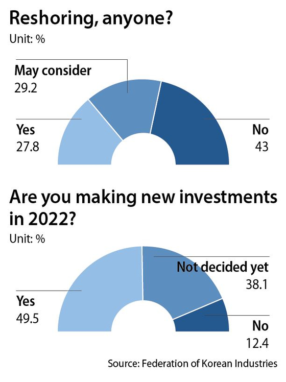Of the interviewed companies, 27.8 percent said they were considering "reshoring" businesses back to Korea. That’s nine times more than in 2020, when only 3 percent of companies in a similar survey said they were considering it.