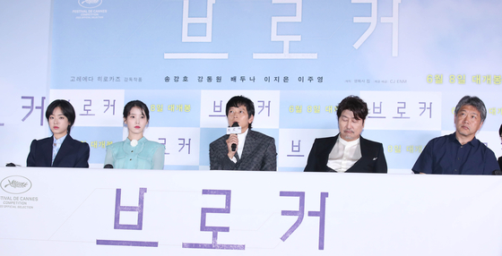 From left, actors Lee Joo-young, Lee Ji-eun, Gang Dong-won, Song Kang-ho and director Hirokazu Kore-eda, answer questions at the press conference for the film "Broker" at CGV Yongsan I'Park Mall in Yongsan District, central Seoul, on Tuesday. “Broker” tells the story of a group of people who embark on a journey to find a new family for a baby who was found in a baby box, where babies can be anonymously dropped off to be cared for by others. For his performance in the film, lead actor Song received the Best Actor Award at the 75th Cannes International Film Festival on Saturday. The movie hits local theaters on June 8. [ILGAN SPORTS]