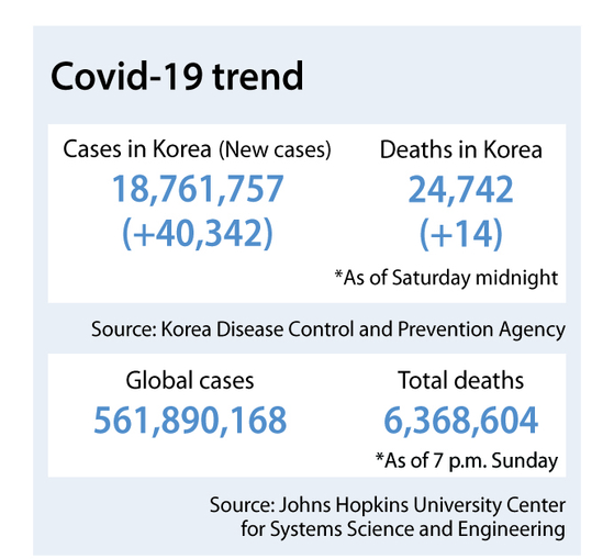 Korean health authorities on Sunday morning announced that 40,342 new Covid-19 cases were detected on Saturday, nearly double the week-earlier figure. Saturday's figure was four times the number two weeks prior.