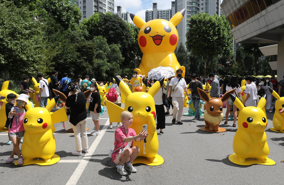 Visitors to the "Pokemon Festival 2022," which kicked off on Wednesday at the Jamsil Olympic Stadium, southern Seoul, take pictures with a giant Pikachu that's 15 meters (49.2 feet) tall, as well as other smaller Pokemon characters. The festival runs until Aug. 14. [NEWS1]