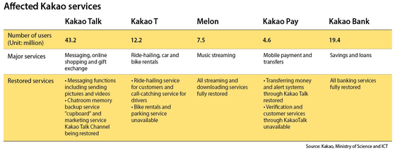 Users could message and send pictures to each other on the KakaoTalk app but could not use the “cupboard," which stores data sent in the chatroom in the past. The KakaoTalk Channel service, a marketing and advertisement page for companies, was still being fixed.