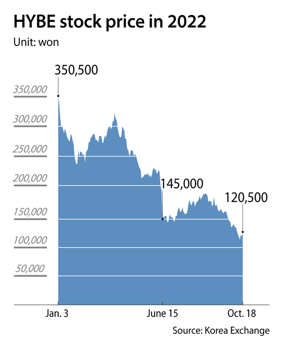 In October 2020, the company — then known as Big Hit Entertainment — went public at 135,000 won a share. It rose as high as 421,000 in November 2021 only to fall back steadily since then.