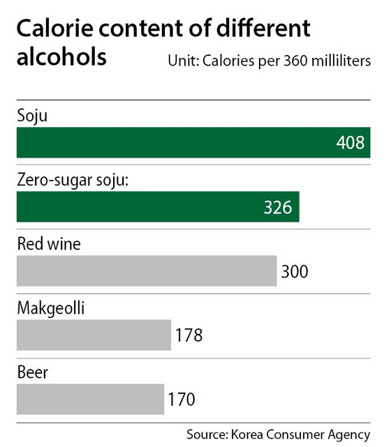 But even though its sugar content is zero, sugar-free soju still has an average of 326 calories per 360-milliliter bottle, which is still more than the same amount of red wine, makgeolli (Korean traditional rice wine) and beer, according to the Korea Consumer Agency.