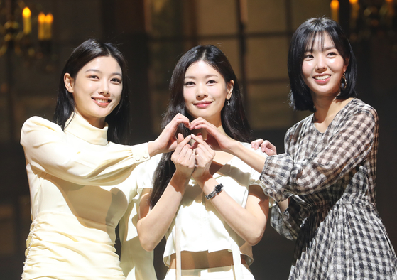 From left, actors Kim You-jung, Jung So-min and Chae Soo-bin pose during Tuesday’s press conference for the play “Shakespeare in Love,” currently being staged at the Seoul Arts Center’s CJ Towol Theater in Seocho District, southern Seoul. Adapted from the hit 1998 romantic comedy, the play tells the fictional story of playwright William Shakespeare writing his masterpiece “Romeo and Juliet” (1597) after falling in love with a play actor named Viola. The play runs until March 26. [NEWS1]