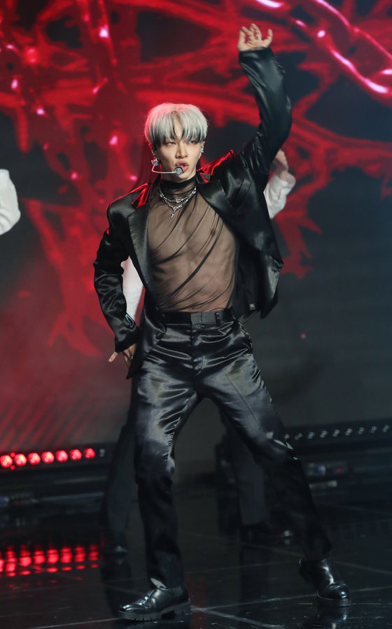 Singer Lee Gi-kwang from boy band Highlight performs lead track “Predator” — from his first full-length solo album of the same title — during a showcase on Monday at the Ilchi Art Hall in Gangnam District, southern Seoul. The catchy but dark synthwave number sings about being unable to escape intense feelings of love.