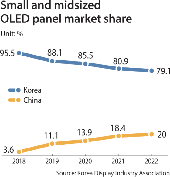 Korea's market share for small and midsized OLED panels which used to stand at 88.1 percent in 2019 tumbled to 79.1 percent, according to statistics provided by Korea Display Industry Association.