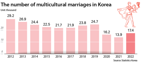 The number of multicultural marriages last year jumped 25.1 percent from a year earlier to reach 17,428, according to Statistics Korea data from late November. Among them, 66.8 percent were foreign wives, 20 percent were foreign husbands and 13.2 percent were naturalized Koreans.