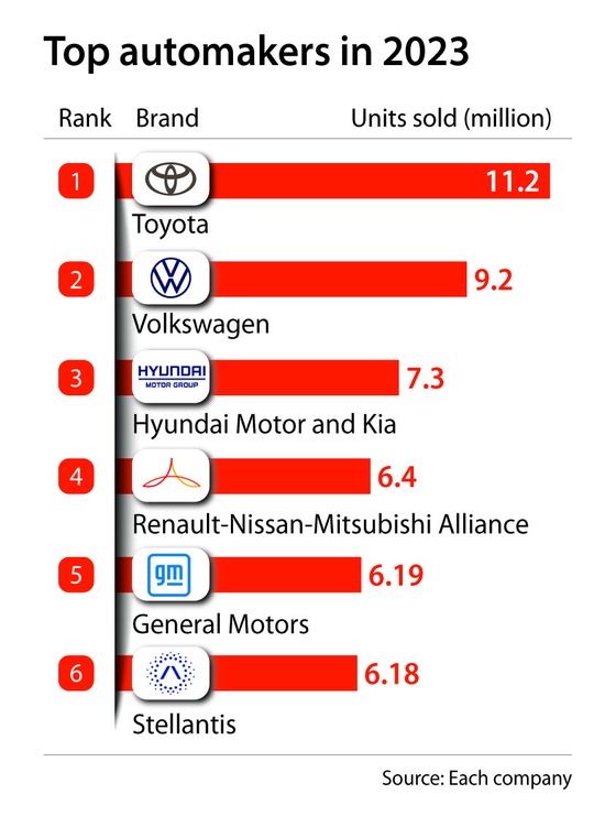 The Hyundai-Kia group widened its gap with the Renault-Nissan-Mitsubishi Alliance, whose sales grew 4 percent to 6.2 million units in 2023, and also beat General Motors with 6.19 million vehicles and Stellantis at 6.18 million units.