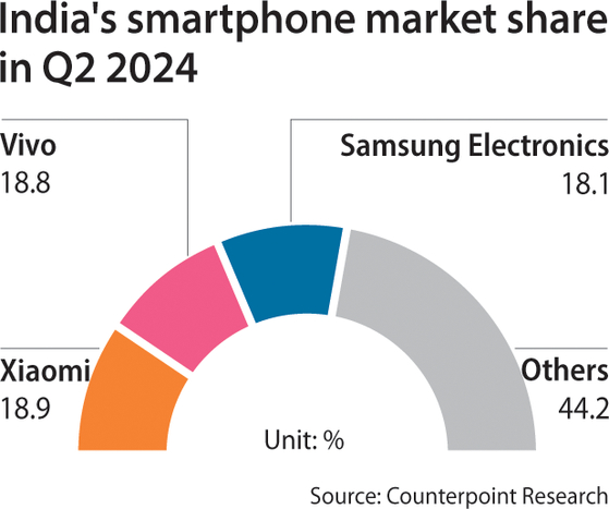 Samsung Electronics accounted for 18.1 percent of India's smartphone market in terms of shipments, coming in after China's Xiaomi and Vivo, which took up 18.9 percent and 18.8 percent of the market, respectively.