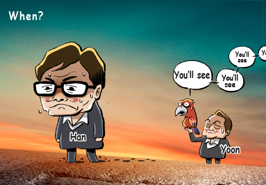 During a meeting at the Presidential Office in Yongsan on Monday, President Yoon Suk Yeol refrained from responding to three key proposals made by conservative People Power Party (PPP) leader Han Dong-hoon: suspension of first lady Kim Keon Hee's public activities, cooperation in addressing the allegations involving her and a personnel reshuffle of presidential aides perceived to have close ties with her. The 81-minute meeting, conducted over tea without a meal, reportedly saw President Yoon dodging questions and repeatedly saying, “You'll see.” Observers have characterized the outcome as being “virtually a fruitless meeting.”