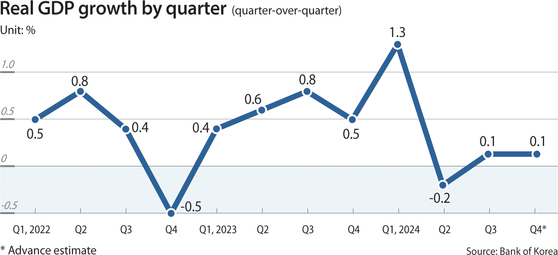 Real GDP expanded just 0.1 percent in the fourth quarter compared to the preceding three months, according to an advance estimate the Bank of Korea (BOK) released Thursday, coming well below its November projection of 0.5 percent. The jump brought full-year growth to 2 percent in 2024, underperforming the central bank's 2.2 percent November expectation and the government's 2.1 percent estimate released in its Economic Policy Direction on Jan. 2.
