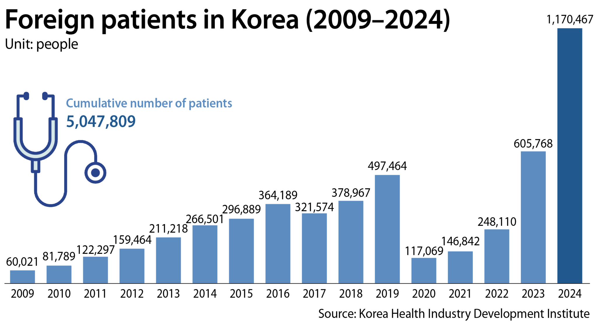 A total of 1,170,467 individual foreign patients received medical treatment in Korea in 2024, nearly doubling from the previous year — a 93.2 percent increase, according to annual statistics released by the Korea Health Industry Development Institute (KHIDI) on Tuesday.