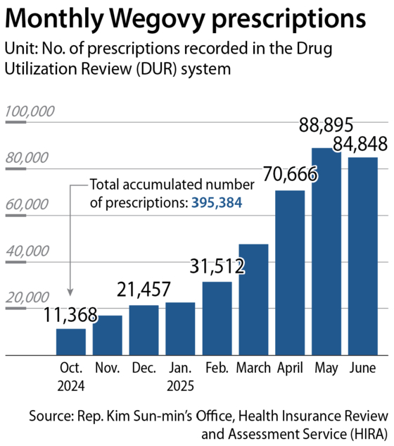The number of Wegovy prescriptions recorded in the Drug Utilization Review (DUR) system from October last year through June this year was 395,384, according to data Rep. Kim Sun-min of the Rebuilding Korea Party obtained from the Health Insurance Review and Assessment Service on Monday.