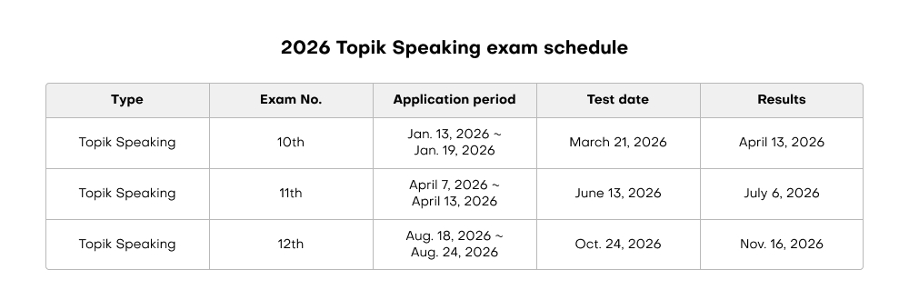 There will be three Topik speaking exams, which will only be administered in Korea.