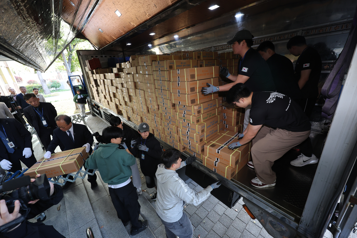 Busan Superintendent of Education Kim Seok-jun and officials from the Busan Metropolitan Office of Education carry test papers for the 2026 College Scholastic Ability Test (CSAT) at a school in Dongnae District, Busan, on Nov. 10, three days before the nationwide exam. The CSAT papers, delivered to local education offices under police supervision, will be distributed to testing sites early on the morning of the exam. [YONHAP]