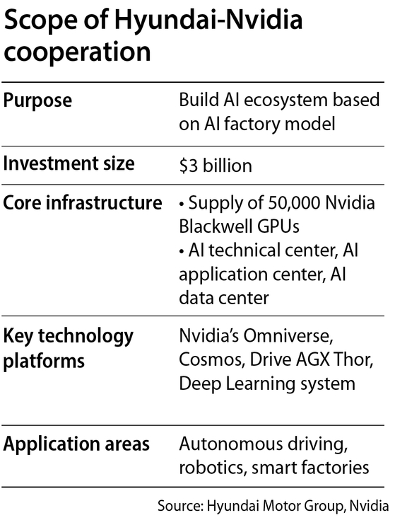 Beyond the GPU supply agreement, Hyundai’s collaboration with the Nasdaq-listed tech firm stretches to a $3 billion investment in the creation of an AI-driven data center that could serve as the backbone for a vertically integrated ecosystem like that of rival Tesla's, where in-house computing power underpins the development of both autonomous driving systems and humanoid robotics.