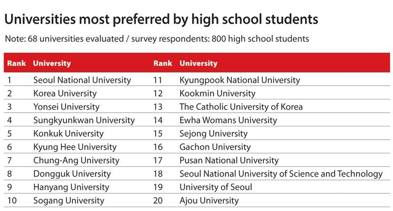 Teachers listed Seoul National University, Yonsei University, Korea University and Sungkyunkwan University — in that order. From fifth place onward, students, parents, teachers and HR managers have different preferences.
