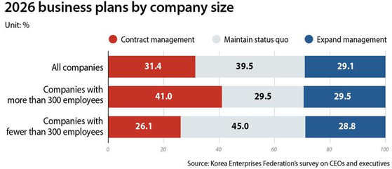 Korean companies are increasingly shifting their business strategies for 2026 from expansion to maintenance, as the economic slowdown and global uncertainty drag on and regulations on businesses tighten. The aggressive drive that once fueled the country’s economic growth through bold corporate investment appears to be fading.