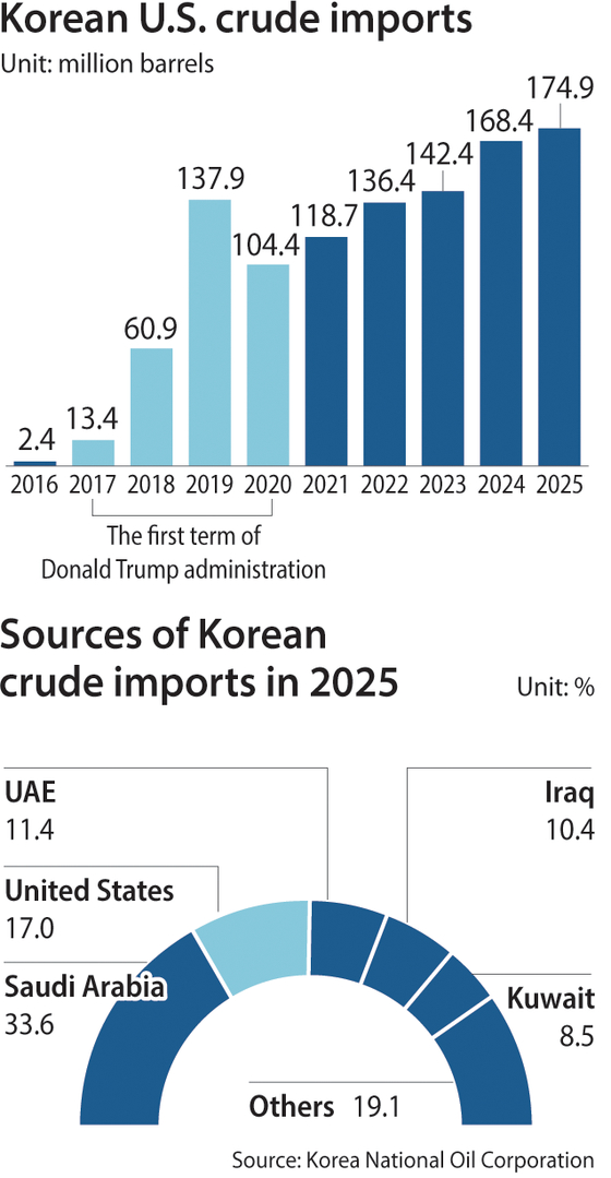 The United States accounted for 17 percent of Korea's crude oil imports in 2025 — second only to Saudi Arabia at 33.6 percent, and higher than the United Arab Emirates at 11.4 percent, Iraq at 10.4 percent and Kuwait at 8.5 percent.