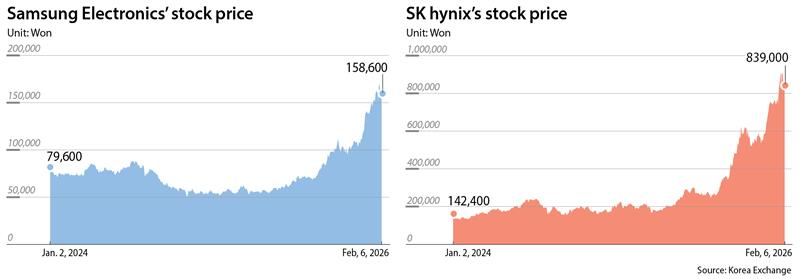 Samsung Electronics historically became the first Korean company to surpass the 1-quadrillion-won market value mark as its shares climbed to a record 169,100 won on Wednesday, while SK hynix recently hit 909,000 won per share, lifting its market capitalization to 661 trillion won — nearly 10 times its peak in the last semiconductor upcycle in 2018.