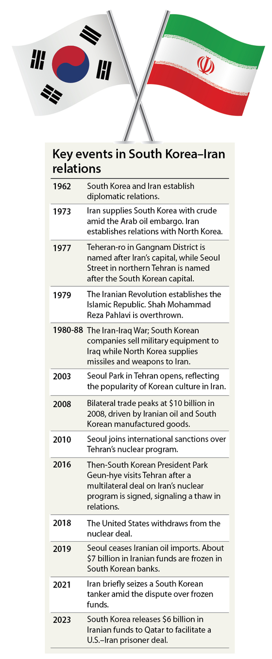 Diplomatic channels nonetheless remained open, and both Seoul and Tehran have periodically expressed interest in restoring trade if sanctions ease. Their relationship has also served as a conduit for indirect U.S.-Iran engagement. In 2023, South Korea transferred $6 billion in frozen Iranian assets to accounts in Qatar as part of an arrangement that secured the release of five Americans imprisoned in Iran.