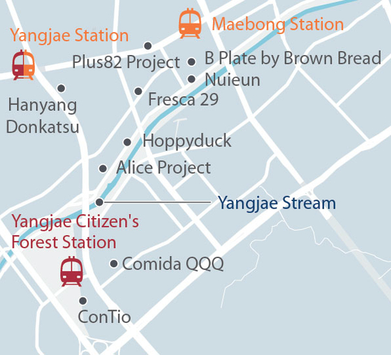 This section of the Yangjae Stream is Seoul's latest hot spot for enjoying the cherry blossom season, alongside well-known destinations like Yeouido Hangang Park and Seokchon Lake Park. What was once a quiet neighborhood of scattered diners and cafes serving longtime regulars is now lined with polished restaurants, artisanal coffee shops and galleries.