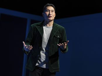 Singer and actor Im Chang-jung, right, and musical actorShin Young-sook act out a key scene from the Korean production of Broadway's hit musical “Mrs. Doubtfire” during a local press event held at Charlotte Theater in Songpa District, southern...