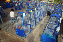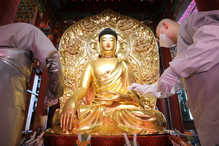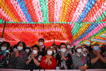 Sripriya Ranganathan, ambassador of India to Korea, sixth from right; Ven. Hyun Moon, head monk of Tongdosa Temple, fifth from right; and Yeo Han-gu, secretary to the president for the New Southern and Northern Policy, second from right, celebrate...