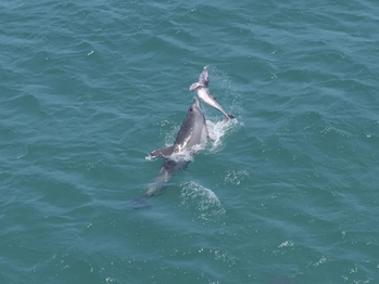 A group of Indo-Pacific bottlenose dolphins passes a tourist ship in coastal waters near Daejeong-eup, Seogwipo, Jeju Island, amid sunny weather on Monday.