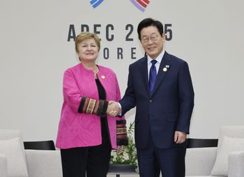 President Lee Jae Myung met with IMF Director Kristalina Georgieva in Gyeongju on Friday to discuss Korea’s economic outlook and the world’s uneven recovery, stressing the importance of reform, trust and preventive cooperation against future crises.