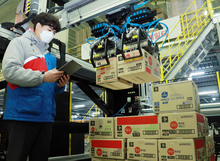 A CJ Logistics employee operates robotic arms to move around boxes at one of the logistics company's warehouses.