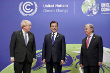 President Moon Jae-in officially declared South Korea's upgraded nationally determined contributions (NDC) targets, committing to reduce greenhouse gas emissions by at least 40 percent by 2030 at the United Nations climate summit in Glasgow Monday.