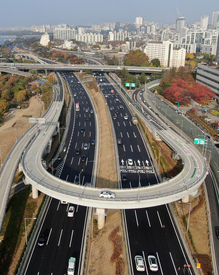 Cars on Tuesday use a ramp connecting Olympic Bridge with Olympic Highway in southern Seoul. Seoul's city government opened the new overpass on Monday.