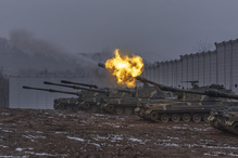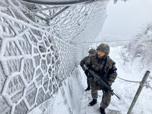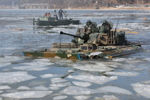 A K21 armored vehicle from the Capital Mechanized Infantry Division navigates a frozen river in Pocheon, Gyeonggi. The South Korean military drill coincided with North Korea launching multiple cruise missiles into the Yellow Sea on the same day.