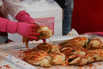 Financial firms based in Yeouido participate in a kimchi-making event that will see 70,000 kilograms donated to 160 social welfare organizations.