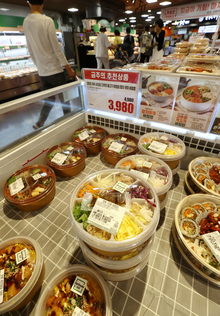 Three different types of bibimbap boxes will be discounted and sold for less than 4,000 won ($3), according to Lotte Mart on Thursday. Bowls of bibimbap shown are sold at Lotte Mart's Songpa branch in southern Seoul on Thursday.