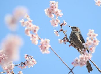 A warbling white-eye forages for nectar on a branch of a cherry blossom in full bloom in Suyeong District, Busan, on March 10.