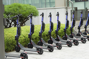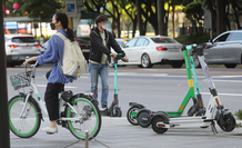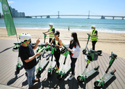 A safety instructor from electric scooter-sharing service Lime is educating riders on safety rules Thursday at the Gwangalli Beach in Busan to educate people on the new traffic laws for electric scooter riders.