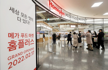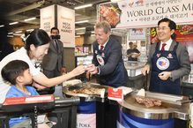 CEO of Homeplus Lee Jae-hoon, right, and Jim Pillen, governor of the U.S. state of Nebraska, grill and serve 1855 Black Angus beef from the United States at the Homeplus Mega Food Market in Gangseo District, western Seoul, on Thursday afternoon.