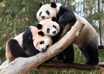 Twin pandas move out of mom’s place. Rui Bao,left and Hui Bao, right, twin giant pandas at Everland’s Panda World in Yongin, Gyeonggi, spend time with their mother, Ai Bao, on Aug. 12.